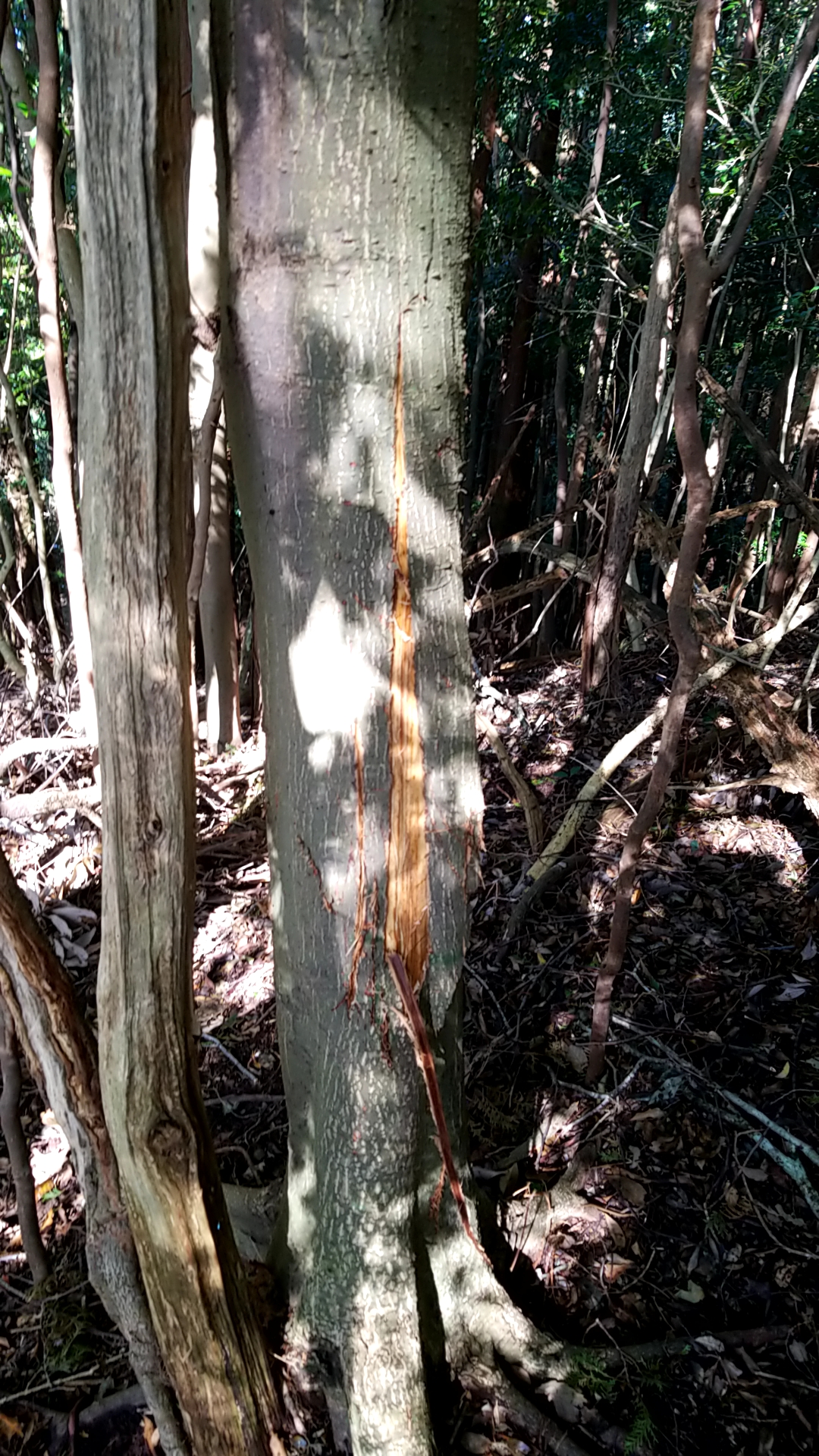 円周には獣道が数本走っていて期待が高まります。円柱の地形を登り、平らな面にある寝屋を囲む4本の木々は寝屋に面した表皮が削られています。オス鹿が武器である角の先端を研いだ跡です。