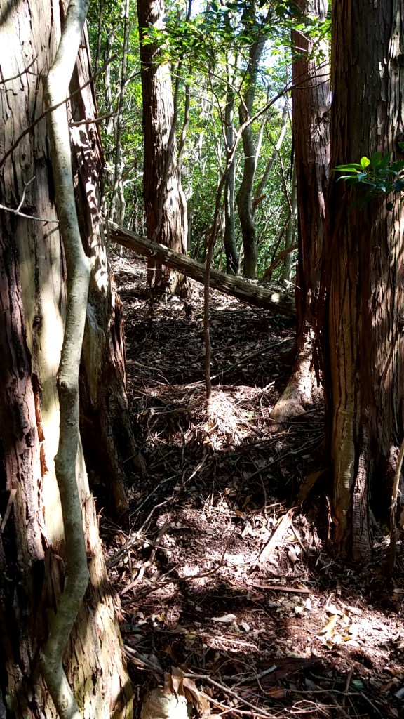 一瞬視界にとらえたオス鹿は尾根筋を登って行ったように見えたので、わたしも直登を再開します。400mほど登ると尾根筋が消え、斜めにカットした円柱を斜面に据え付けたような地形になります。