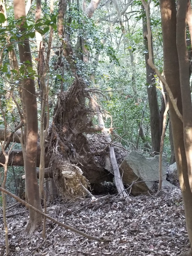 群れが遠くへ逃げていくのに、手前にガサガサと派手な音を立てて走ってくるものがいます。耳を澄ましていると、眼下にある倒れた大木の根にできた空洞にウリ模様が駆け込んできました。距離は30m。フゴフゴ鼻息が聞こえてきます。