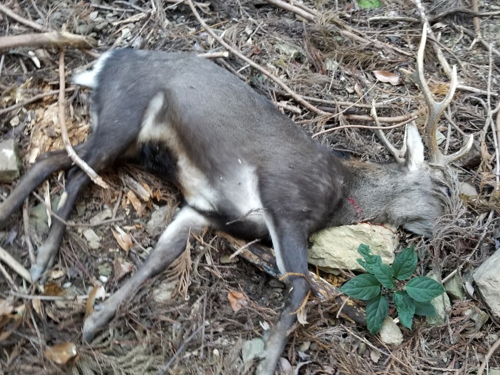 「近距離で真正面、これはダメージが大きいはず、銃声とともにオス鹿が倒れたら二発目でとめるかナイフでとめさしか..」そんなイメージで残心しながら一歩進むとオス鹿は登ってきた斜面を勢いよく駆け下りていきます。