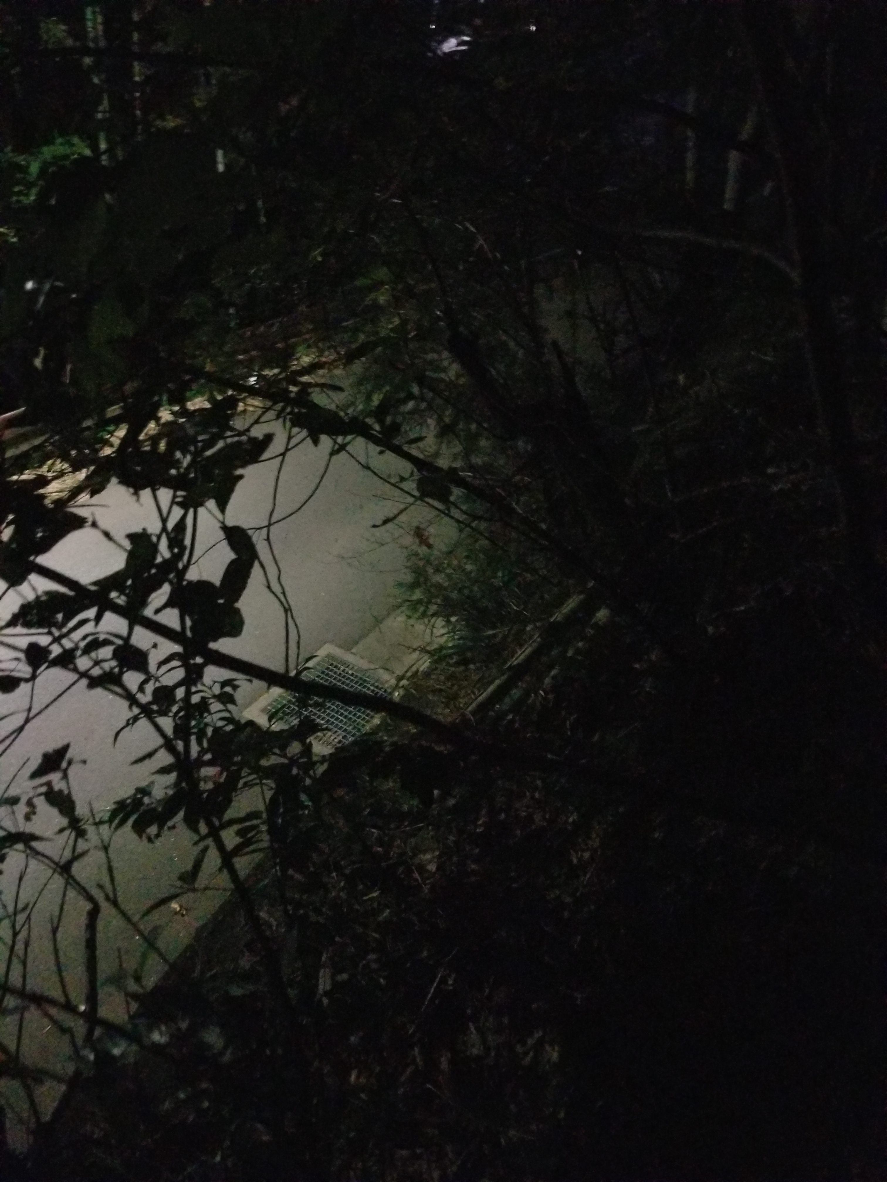 入山ポイントと逆に数十m移動すると壁の高さが路面に近づくのが分かります。遠くに街路灯もあって路面が見えてきました。どうやら高さが2mのあたりで行き止まりです。手掛かりになる地面の土を払いのけ滑らないように足から壁に這わせていくものの、自重に耐えられず50㎝ほどの高さで落ちてしまいました。