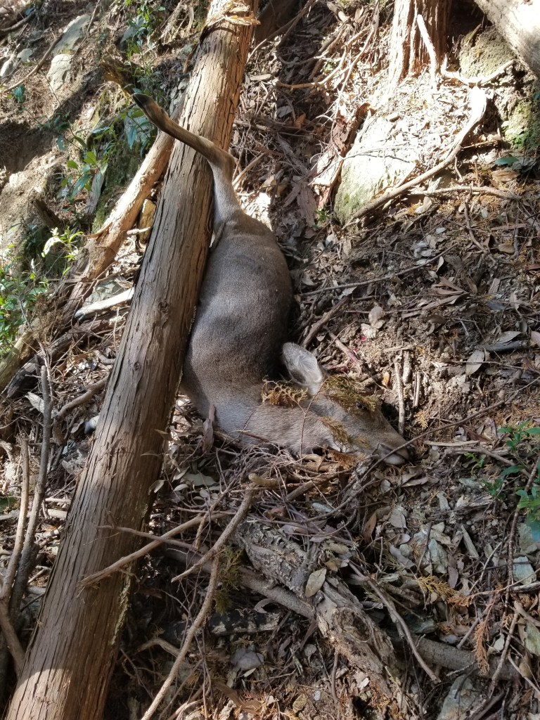 メス鹿が中腹で立ち止まり振り返った瞬間にトリガーを絞り切って撃ちました。お盆で飾る精霊馬のように4本の足が伸びたまま固まり、もんどりうちながら斜面を落ちてきます。倒木に引っかかって止まりピクリとも動きません。近づいてネックの着弾を確認しました。