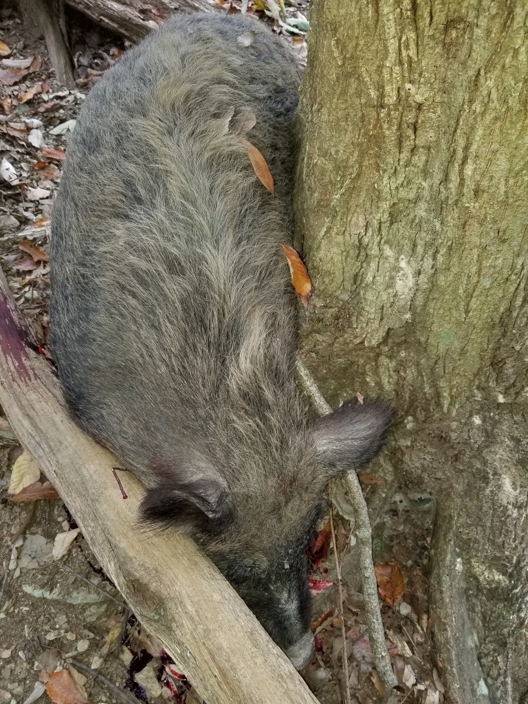脂がのったブルブルで背中の毛がボアボアのでかいメス猪を獲って嬉しいのですが、重くて入山ポイントに向けて斜面を登れません。下るとどこに出るのか見当がつかなくてこの山に詳しい師匠にヘルプお願いしました。