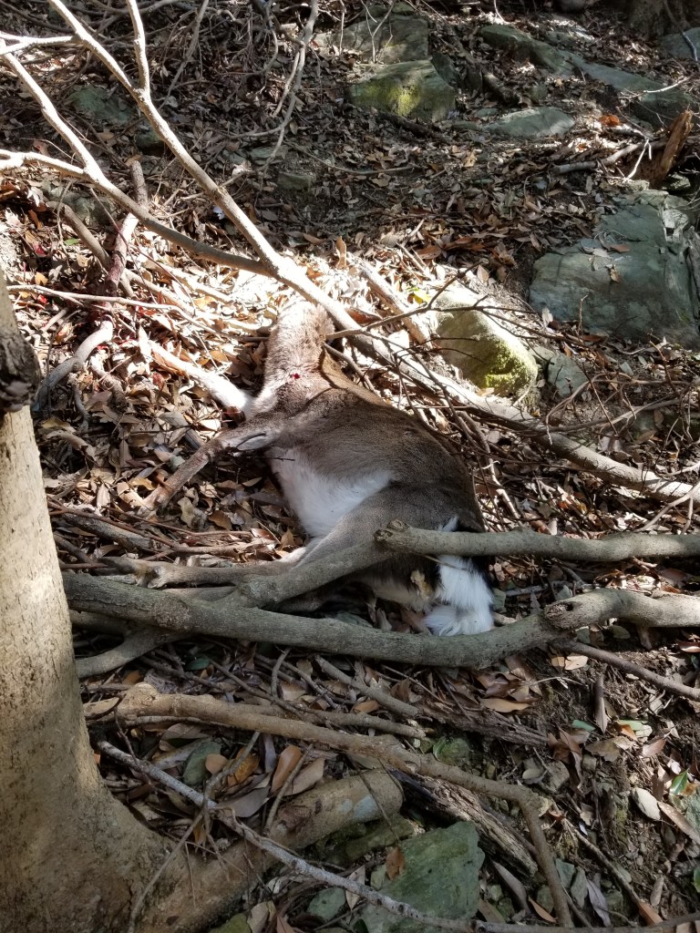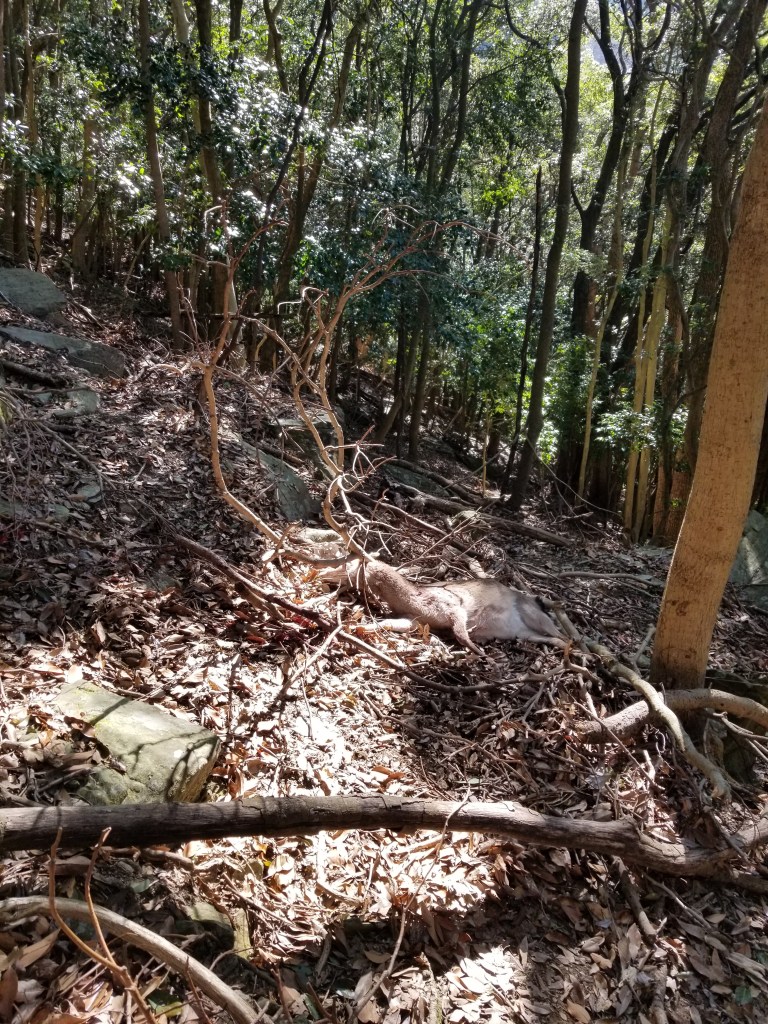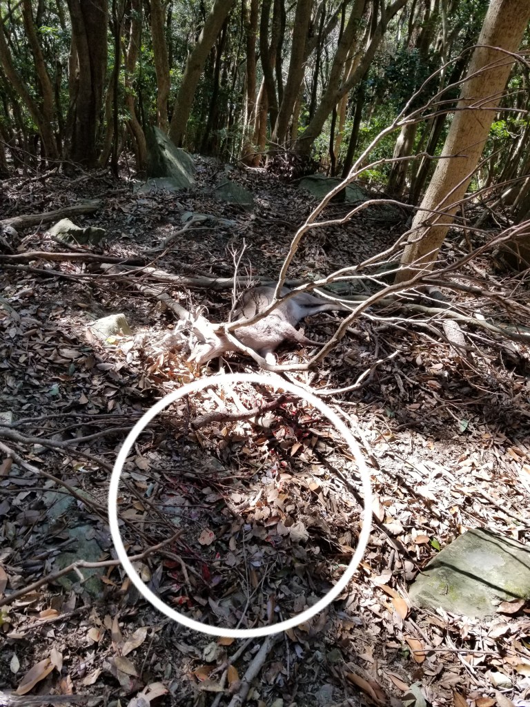中腰でもう一度、斜面をじっくりと見渡します。血糊の周辺を丁寧に見なおして再捜索すると折れた太い枝に頭を突っ込むように横たわっています。