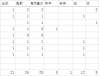 そうならないように、出猟回数、発射数、回収した獲物にあたった弾数、失中数、半矢で逃した頭数、獲物の獲得数を記録しています。