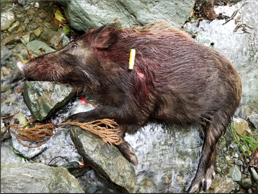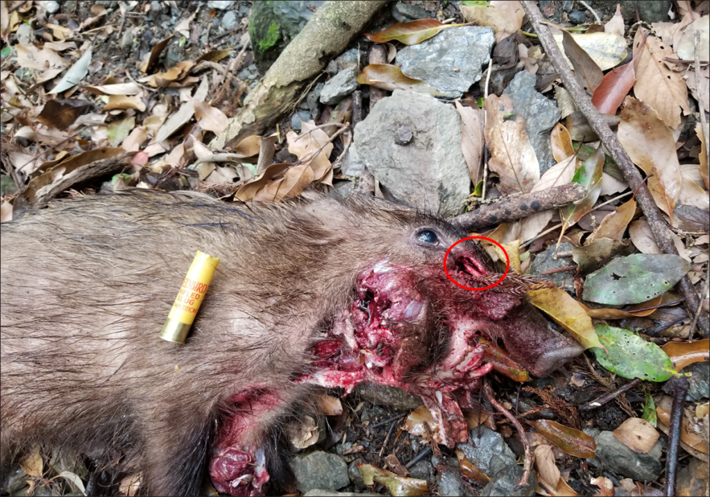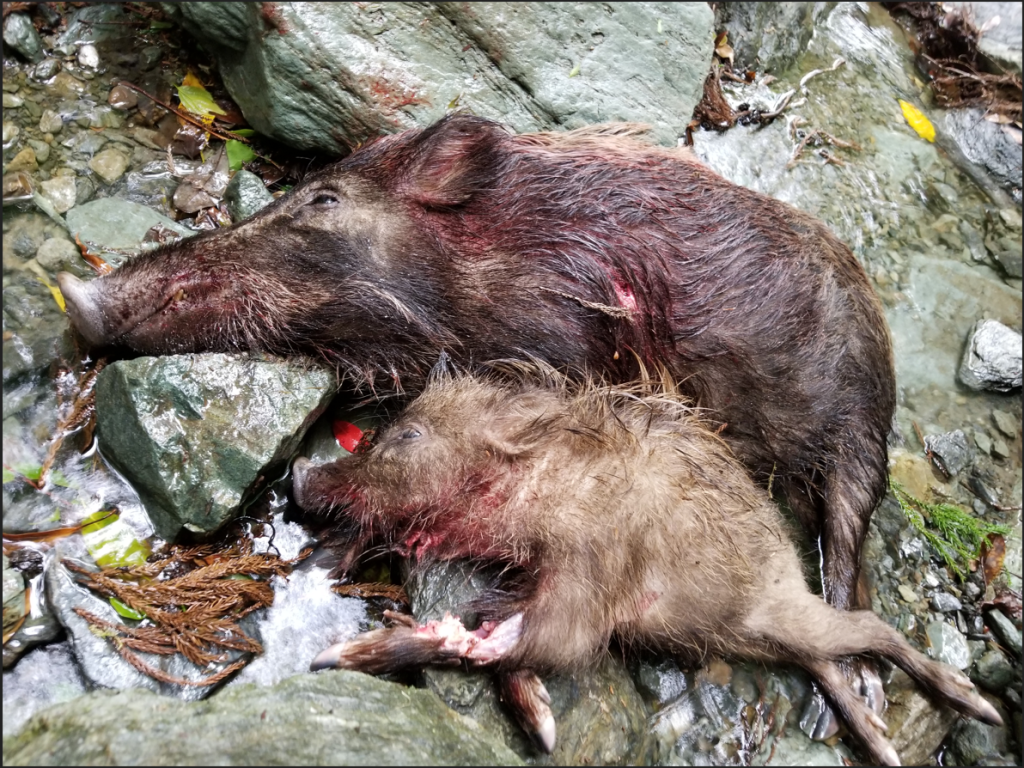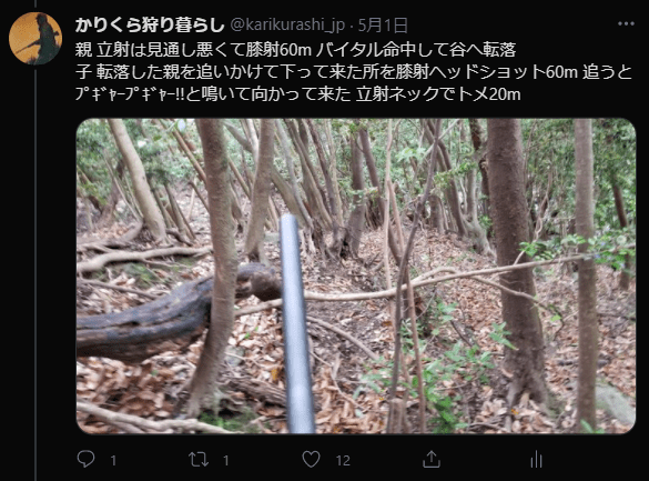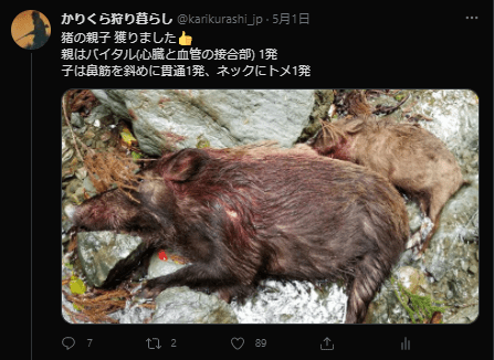 多くのハンターが言及している通り、親子でいたら親から撃つこと。子から撃つと必ず親は逃げ去ってしまうが、親から撃つと子はその場に留まったり、戻ってきたりする。子も撃つチャンスが生まれる。親がいなくなると子の生存率は下がるそうなので、駆除の成果としても期待できる。