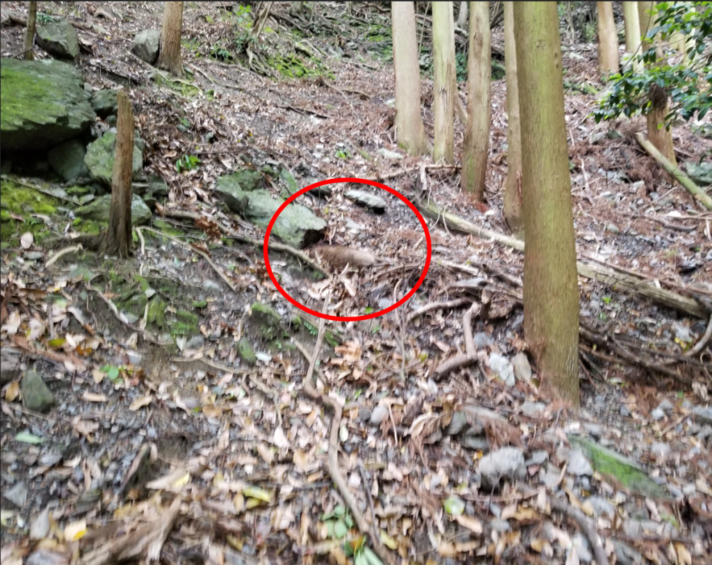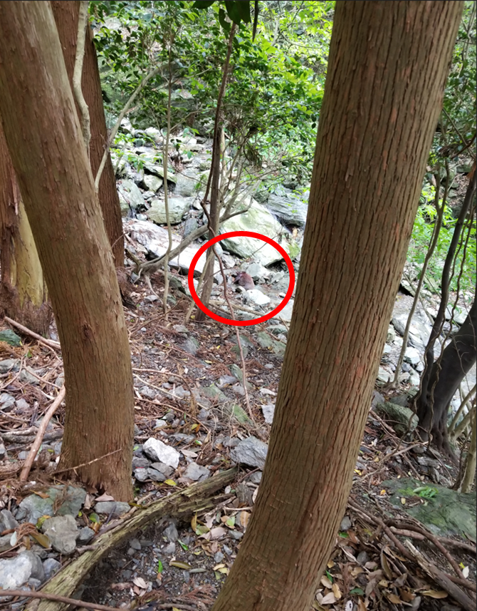 下の画像、右が沢。猪親子が沢沿いを離れて半時計回りに登っている様子が、立木の隙間からチラチラと見えています。