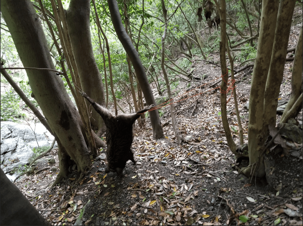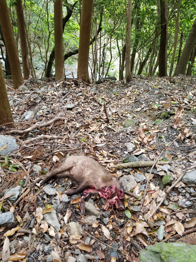 ヘッドショットはあくまで脳幹・脳漿にダメージを与えないといけない事が理解できた。鼻筋を撃ち抜いても即倒しない。距離と高低差と子猪のサイズを考えるとヘッドショットを選択した判断には自分の技量に過信があったと言える。