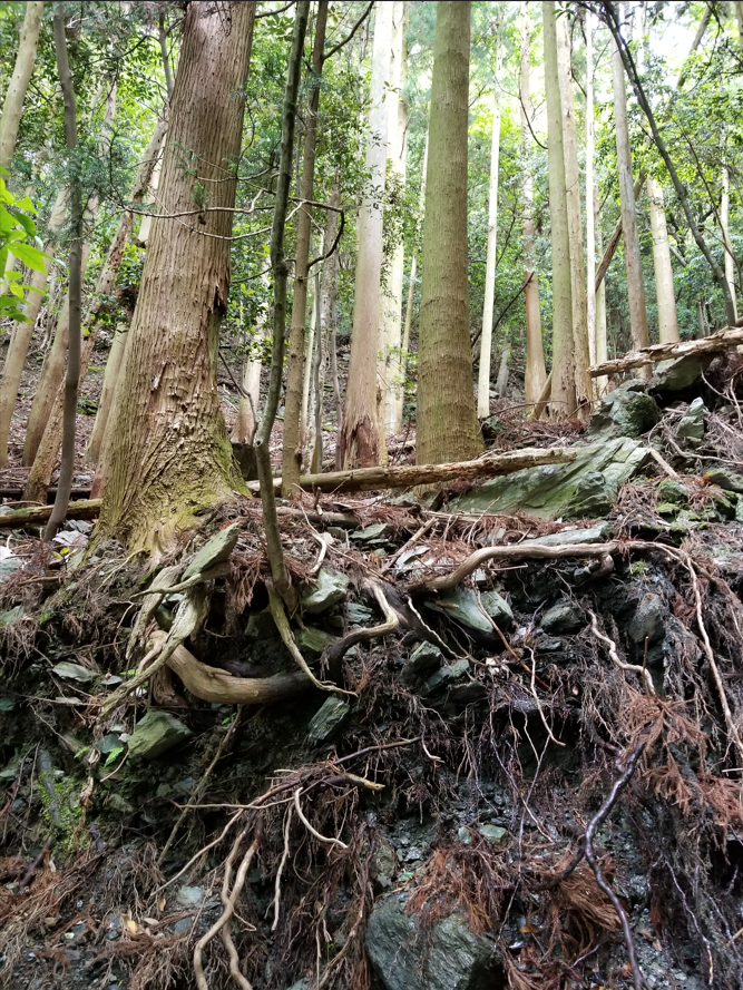 そろそろ帰るか、そう思って山を下りる気持ちになったとき微かに沢の音が聞こえました。何気なく沢をのぞき込むと思いがけない急斜面。沢まで70mはあるでしょうか。
