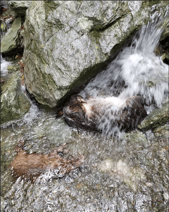 親猪が転げていった斜面に向かうとすぐに沢に浸かっているのが見えました。