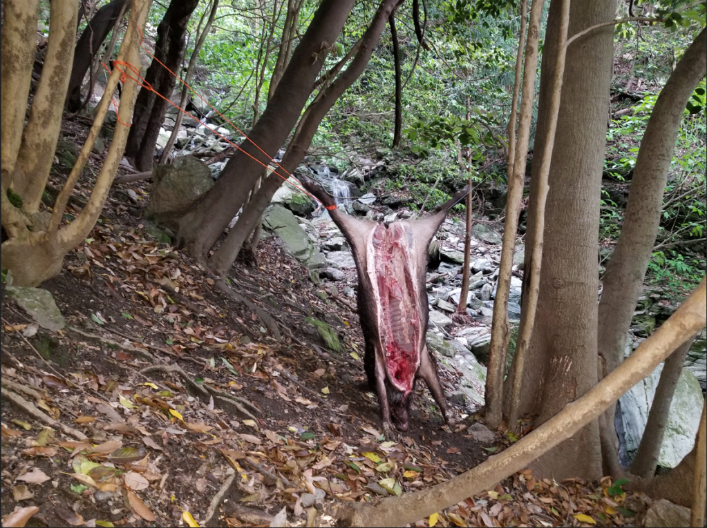 たてがみのあるいいサイズのメス猪です。この時期の子連れの割には脂もあるような体つきです。