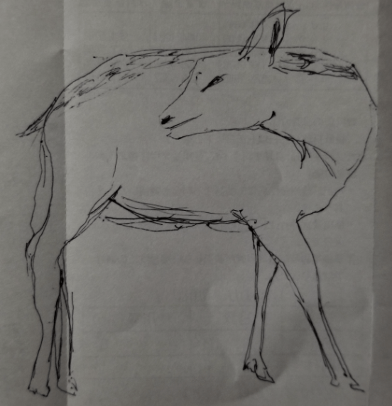鹿は右半身を見せて立ち、顔をぐるりと胴体に回して毛繕いを始めました。