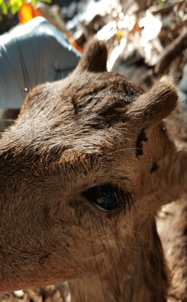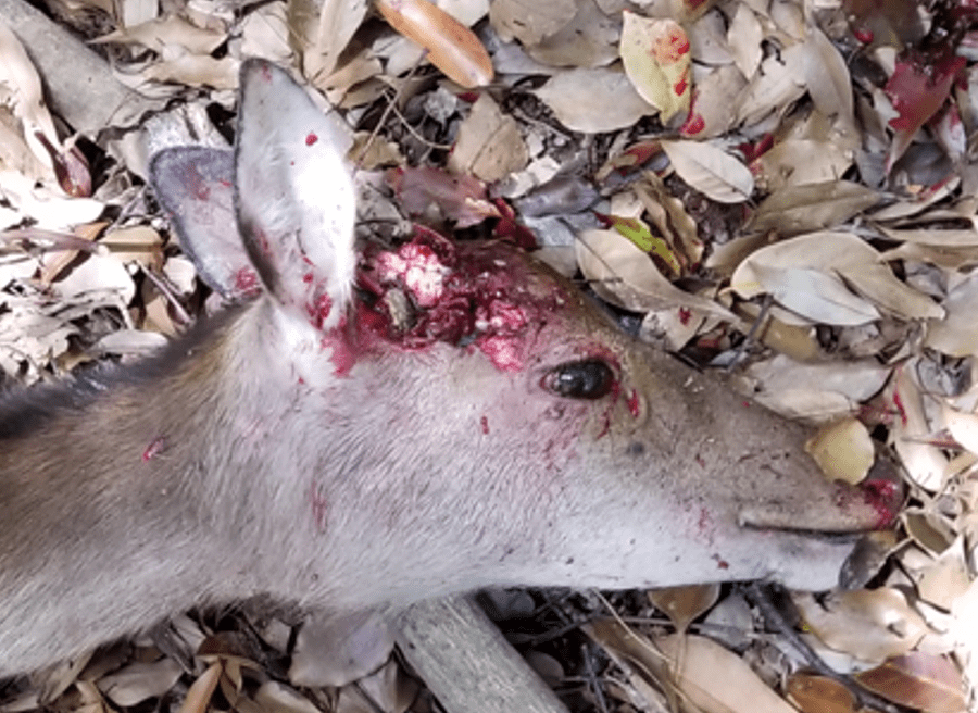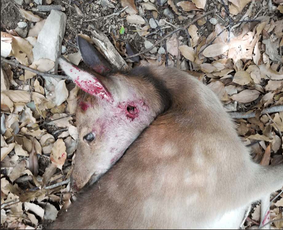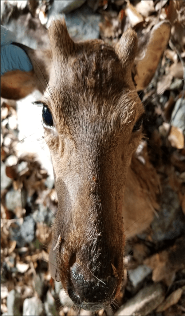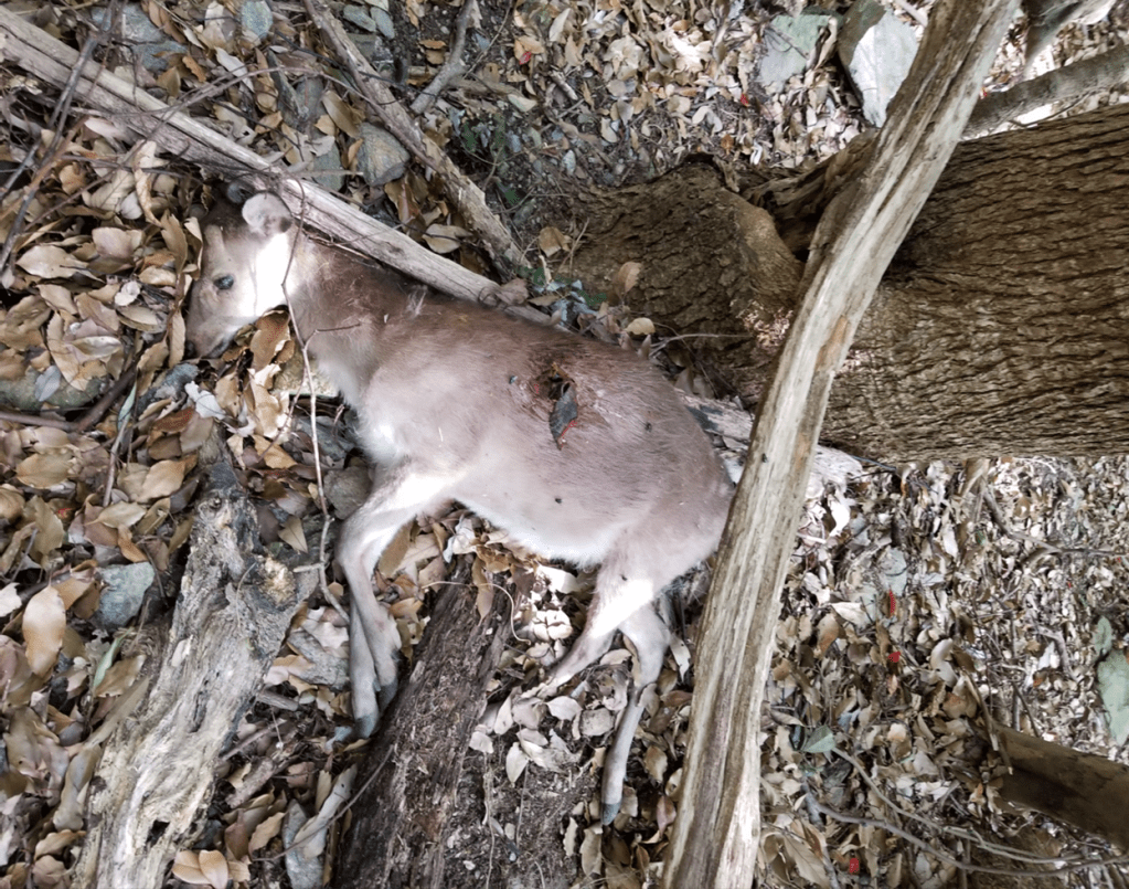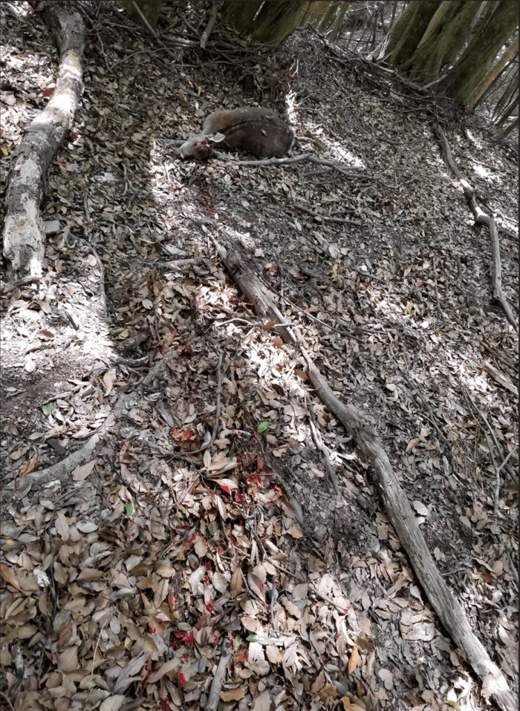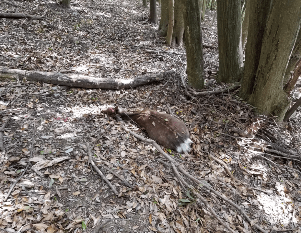 血痕はないのですが、内臓の臭いが強くなる方へ進み続けると小鹿が絶命していました。トラッキングと崖を下りるために時間を費やしてしまい、銃創にはハエがたかっています。