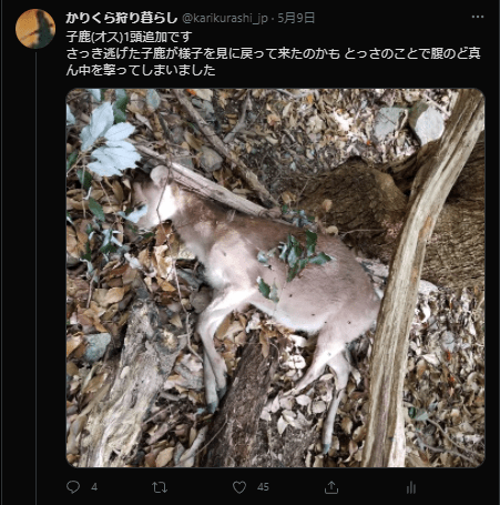 単独忍び猟で1日に二頭獲れば悪くない、というより後処理を考慮すると二頭が上限という気がします。よく獲ったと言っていいはずですが、糞と血をまき散らして崖を転げ落ちた鹿の苦しみを思うと糞みたいな自分の未熟さに嫌気がしました。