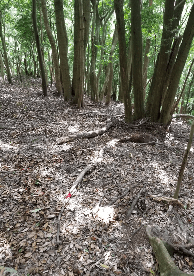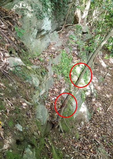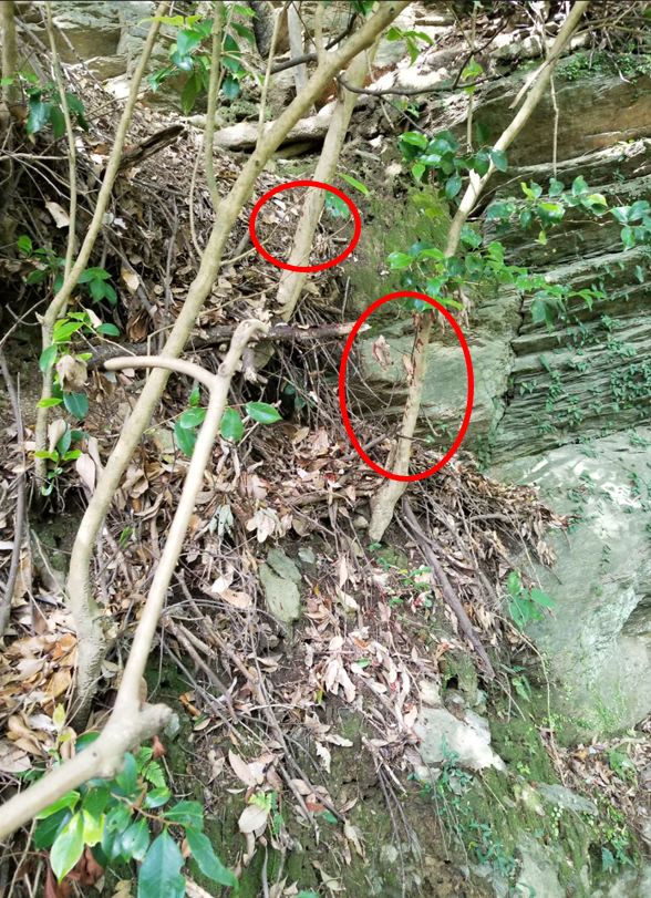 そうすると崖を下り終わる場所の一本の木に複数の痕跡があります。